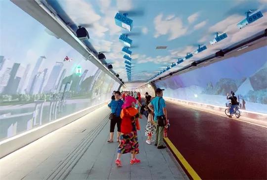 珠海市板樟山新增慢行隧道中使用了無錫視美樂激光顯示科技有限公司的40臺激光投影機,打造了近50米的墻面投影,將珠海城市文化與海洋特色融入其中,點亮悠長的隧道。頂部以藍天白云為底色,并加入飛鳥、熱氣球等元素圖案。往里走,兩側(cè)墻壁每隔約20米便有知名景點在列,步行千米絲毫不覺得審美疲勞。中段會有長約50米、高4米的巨幕投影如畫卷般鋪展于兩側(cè)。投影巨幕的加入,將傳統(tǒng)隧道的逼仄之感一掃而光。
