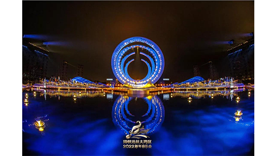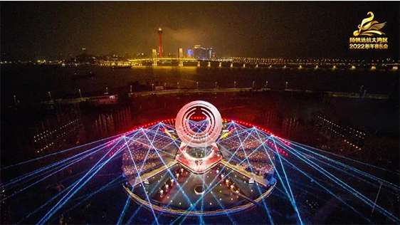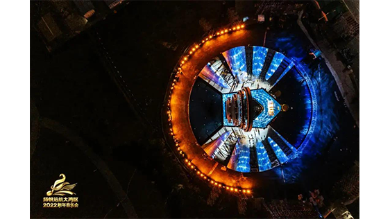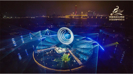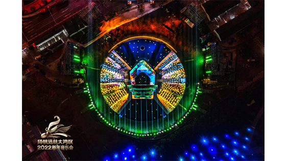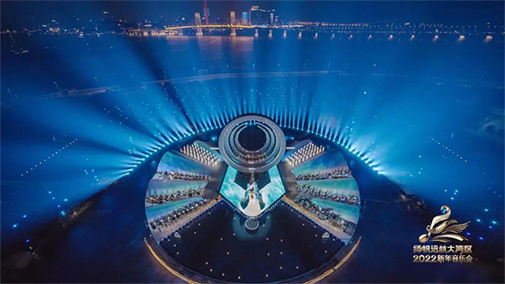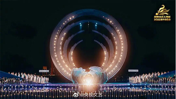 舞臺主體視覺以去舞臺化的概念為出發(fā)點,將舞美空間視覺方向朝城市景觀和裝置融合設計,滿足晚會功能性同時,也可作為城市景觀的一部分存在,賦予舞美多重的功能性。在光影渲染下,2022新年音樂會在新年第一天,深刻詮釋出大灣區(qū)“勇立潮頭敢為先,奮楫揚帆謀新篇”的恢宏氣勢。
