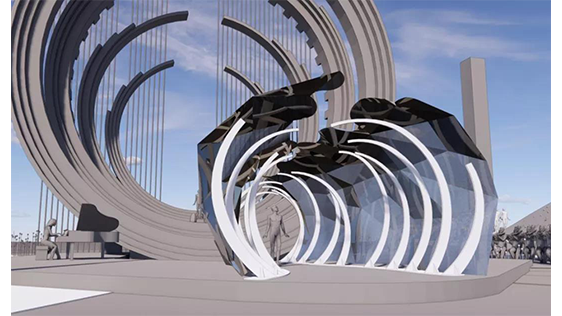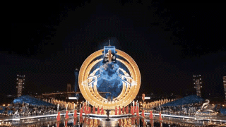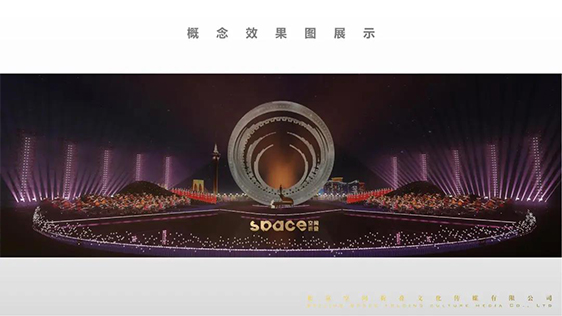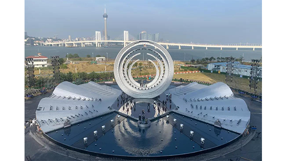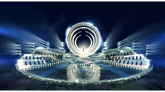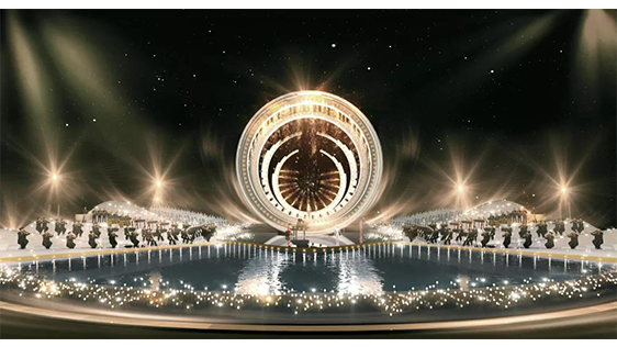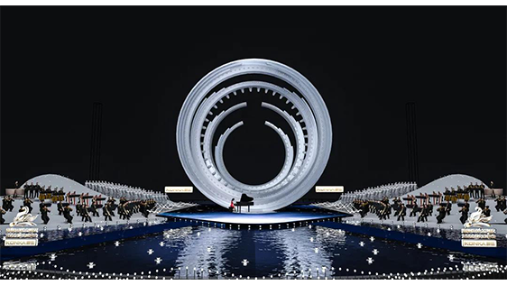 整體舞美由主舞臺和IFC樓頂停機坪舞臺兩部分組成,主舞臺以揚帆遠航,乘風破浪為概念,場地選擇面向珠海橫琴核心地標IFC國際金融中心大廈。背靠大海,隔海相望澳門,舞臺中心構筑物造型簡潔化,一珠入海激起千層浪的主體結構元素處理讓城市夜景做為舞美設計的天然主背景,展現(xiàn)大灣區(qū)“共同家園”的美好景象。