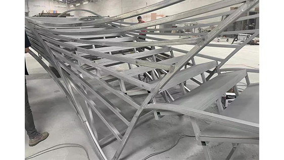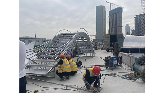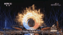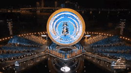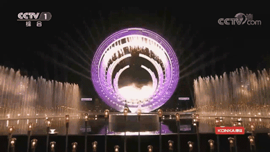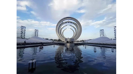 舞臺中心主體構筑分為四組,層層展開,用簡潔抽象化的海浪形式營造表演的氛圍空間。4組直徑不等的圓環(huán)尺寸分別為直徑20m、直徑17m、直徑15m、直徑12m,主體造型上采用全鋼結構形式搭建而成。圓環(huán)上吊掛燈光、水簾、冷焰火等設備,總體重量約100噸。