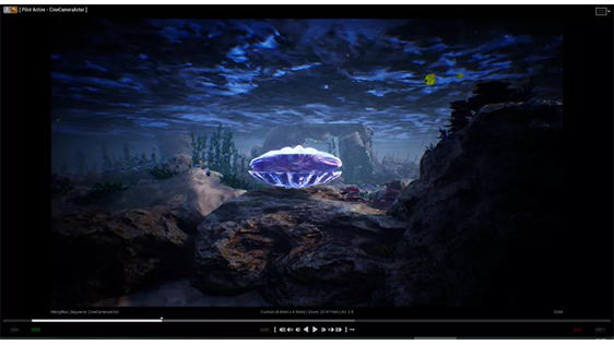 歌曲《夢灣》采用虛擬技術,在虛實結合中做了一場充滿想象的海底美夢。通過實時采集攝像機畫面和摳像遮罩的實時運用,將舞臺區(qū)域獨立出來,置身于海底世界的貝殼中。隨著虛擬攝像機的運鏡,海底貝殼緩慢打開,實景舞臺逐漸顯現(xiàn),虛擬環(huán)境周圍光源逐漸加強,烘托了節(jié)目整體氛圍,表達了美好寓意。