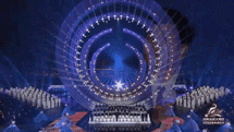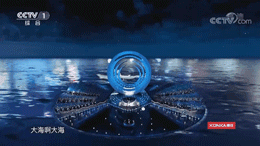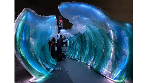 通道置于主舞臺中間,使用顏色主體為藍色、綠色、白色的網(wǎng)紗來構成了海洋和浪花。加上光源投射,營 造出太陽從海浪的縫隙中露面,溫暖的陽光以筆直的姿態(tài)刺穿海浪中間,使人們對未來與夢想充滿向往與憧憬。