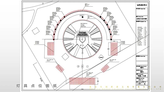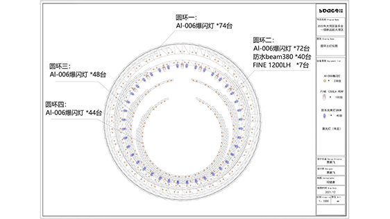 主舞臺的燈光布局在舞美結構造型的基礎上,采用珠"圓”的環(huán)形設置表達美滿、地區(qū)融合的合家歡概念。以簡潔、去舞臺化的構思進行燈位的布局,對舞美主體采用了外投燈具染色、外頭激光勾勒以及內(nèi)置燈具等燈光處理手段,用燈光去呈現(xiàn)大氣、干凈的視覺感受。
