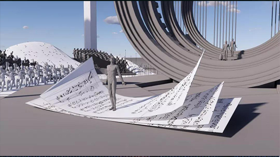在依海而建的大灣區(qū),筑起融合粵港澳三地地域文化的舞臺,共同譜寫彭拜激蕩的華夏之章。樂譜置景以“大海啊,故鄉(xiāng)”優(yōu)美動聽的旋律為主進行設計,畫面 直觀地讓人感受到音樂帶來的藝術之美,一章章樂譜疊放在一起, 海風吹過,一頁頁翻起,像海邊的浪花一樣,隨著感情真摯的歌聲擊拍著海內(nèi)外華夏子孫的心房。