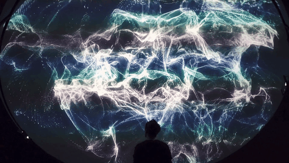在有限的空間里,Refik Anadol 將一串串冰冷的數(shù)據(jù)變得生動有趣,漫天的絢爛射線與粒子光影環(huán)繞四周,為現(xiàn)場觀眾打開了一個浩渺浪漫的宇宙世界。