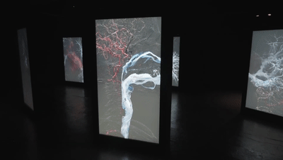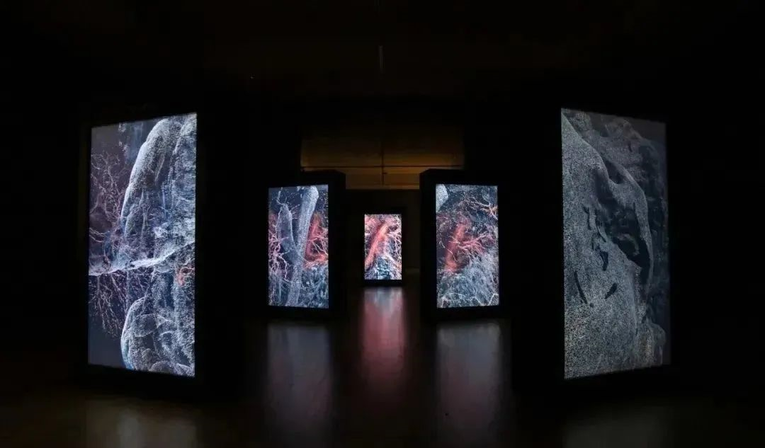 作為 Marshmallow Laser Feast 不斷探索超越我們感官極限的世界的一部分,五屏實時互動裝置《The Tides Within Us》研究了氧氣在心血管系統(tǒng)中的流動,將人體描繪成一個流動的事件,更像一個漩渦,而不是一個靜止的物體。
