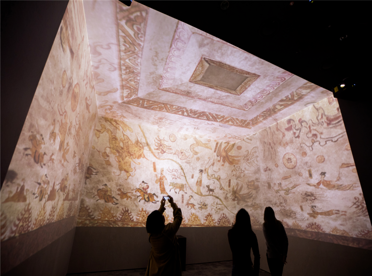 3D數(shù)字影像從四面(前墻、左右墻和天花板)投影,再現(xiàn)了高句麗古墓的壁畫,仿佛站在真正的陵墓內。
