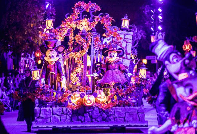 萬圣節(jié)的夜幕降臨,燈光投射在米奇大街的臨街墻上,眼前乍現(xiàn)一條繁華熱鬧的鬼街:迪士尼反派角色傾巢而出,開啟了夜色下“迪士尼反派游行2.0”,紅皇后、庫伊拉、公主的后媽們、海盜船員一起與游客勁歌熱舞,搞怪合影,最后在固定煙火秀中以浪漫又魔幻的魅影詭趣終結(jié)。
