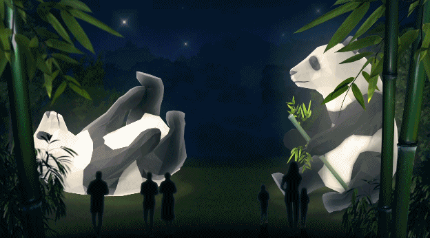 在這里,你可以看到巨大的電子動畫大熊貓在中央草坪上嬉戲、翻滾。長頸鹿在那里高昂著頭顱欣賞星星。水母在水中仙境蠕動著,色彩鮮艷的珊瑚搖曳生姿。