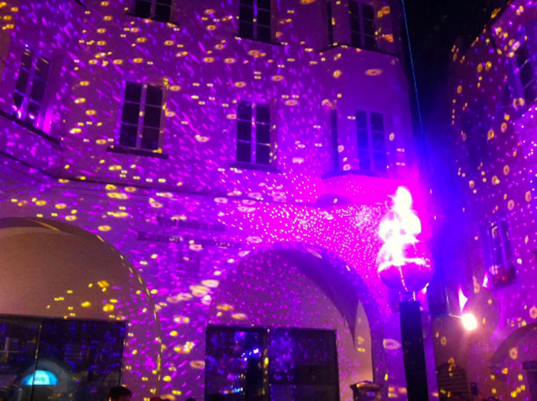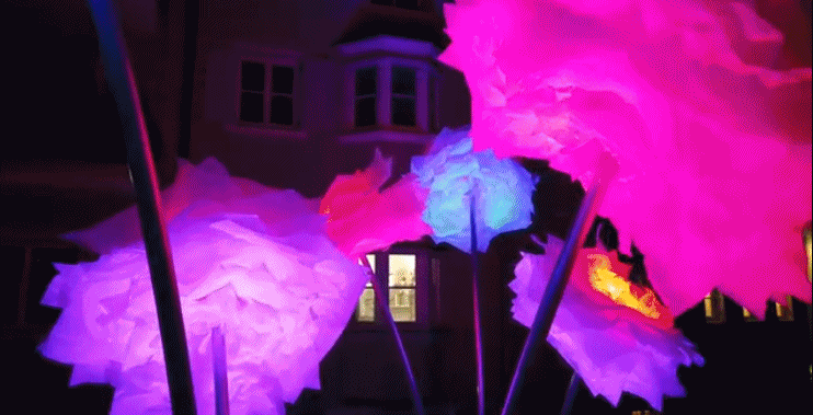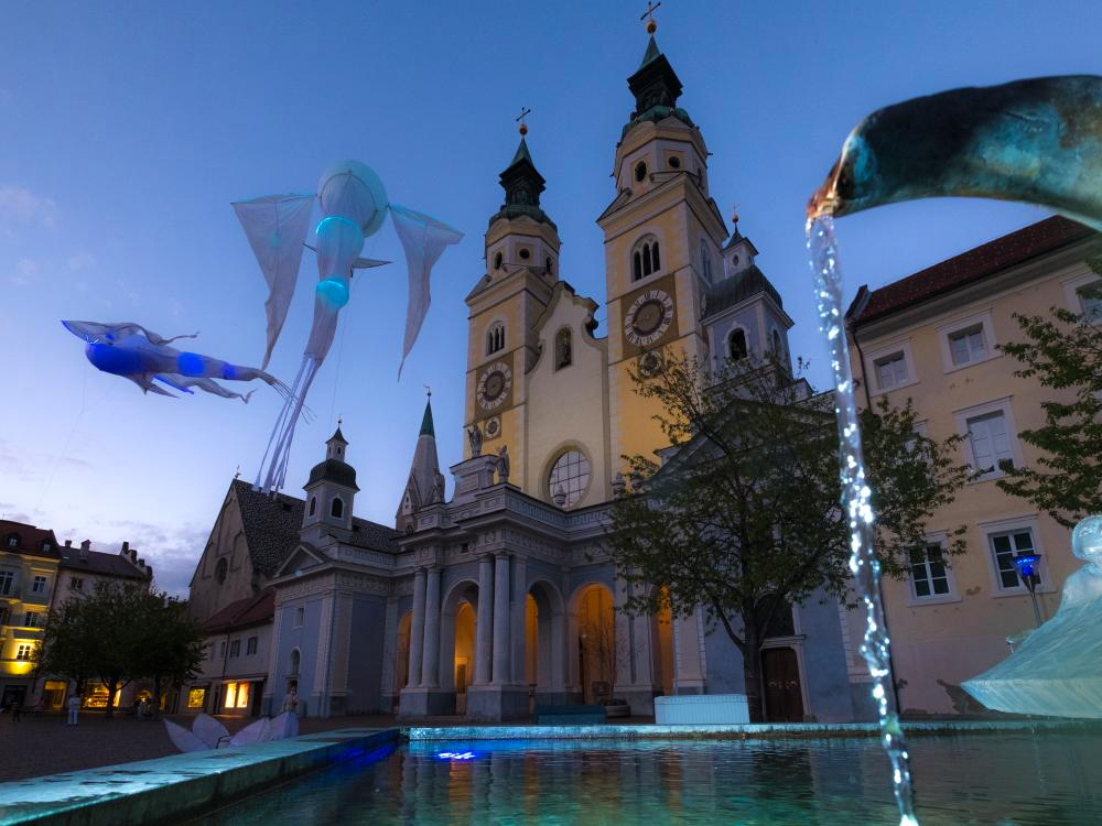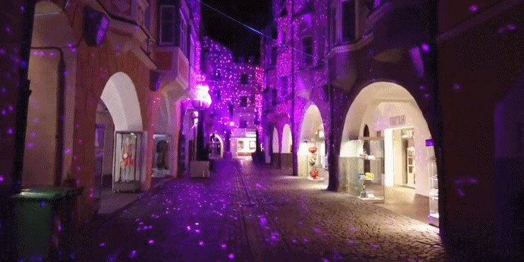 水燈節(jié)用燈光照亮布里克森,兼具奧地利、德國南部建筑風格的小鎮(zhèn)房屋和教堂披上了光影的外衣。藝術(shù)家精心制作的裝置似孔雀開屏,如夜間飛行的蝙蝠,像漂浮的海帶。