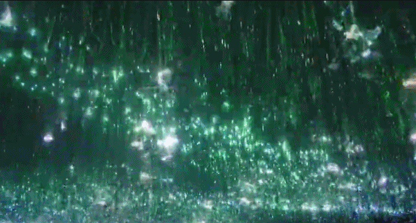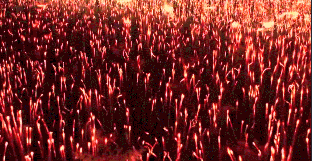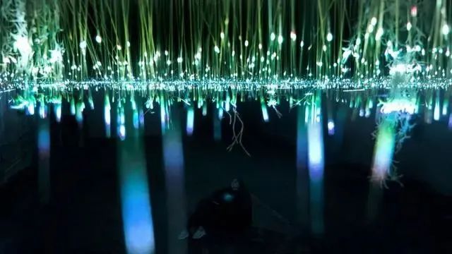 作品由120平方米的懸掛式人造草打造。這些人造草從空中自然的垂下來,形成一個漂浮的綠色草地,并由6 臺定制激光動畫投影儀,以及四聲道音響系統(tǒng)共同組成。