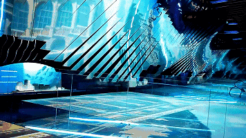 作品設(shè)計(jì)靈感來源于摩納哥王子的環(huán)保宣言,強(qiáng)調(diào)摩納哥發(fā)展藍(lán)色經(jīng)濟(jì)的成就。通過巨型鏡面組成超大動(dòng)態(tài)屏幕與交互墻面,將參觀群眾包圍在藍(lán)色的動(dòng)態(tài)海洋中。