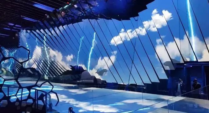 場(chǎng)景中立面巨型鏡面墻裝置部分由36個(gè)動(dòng)態(tài)鏡面葉片組成,地面由LED屏幕覆蓋。利用反射原理,當(dāng)?shù)孛娴挠跋駜?nèi)容發(fā)射到立體鏡面中,形成全沉浸式的海洋奇境。