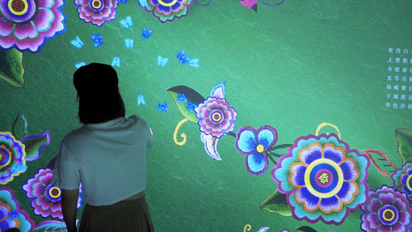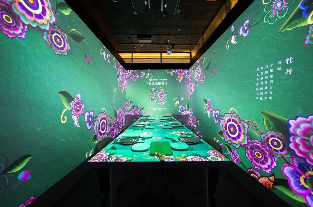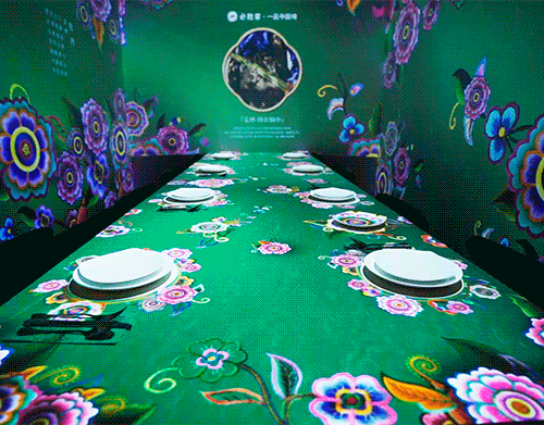 以中國(guó)傳統(tǒng)非遺文化為主題設(shè)計(jì)的光影餐廳,通過大型互動(dòng)裝置,將牡丹化作光影落于餐桌之間,一品金秋盛宴,致敬中國(guó)傳統(tǒng)文化。
