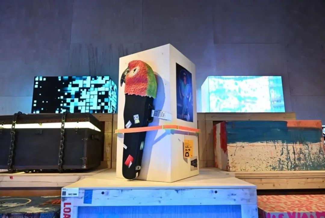 兩個(gè)主要空間中的第一個(gè)的設(shè)計(jì)思路看起來像是來自倉庫的靈感。箱子以一種交錯(cuò)但隱約帶有雕塑感的排列方式,與帶有屏幕的“魔法箱”并列在一起,每個(gè)箱子都堆放在從法國運(yùn)來時(shí)的板條箱上,這些板條箱上還有各種原始的運(yùn)輸標(biāo)簽。