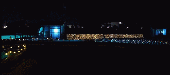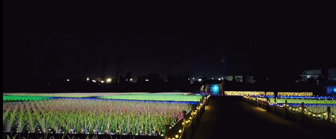 在《TOKYO MEGA ILLUMINATION 》中,以江戶時代為背景的極彩棚田,運用燈光的效果,展現了梯田一年四季不同的景觀,燈光從蔚藍到金黃,營造了如夢似幻的田園美景。