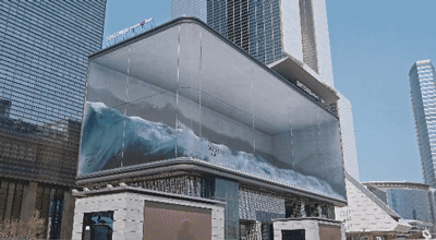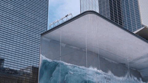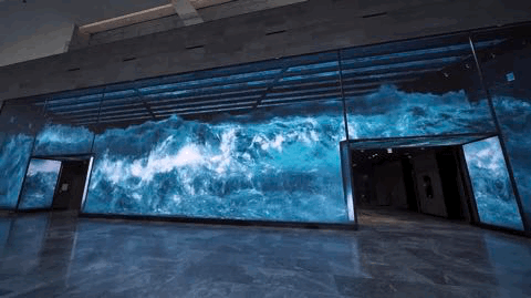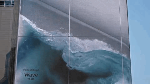 這是韓國(guó)SM娛樂(lè)公司門口安裝的一個(gè)LED顯示屏,該藝術(shù)裝置《Wave》由三面巨屏構(gòu)成立體視覺(jué),配合逼真音效,滿屏波瀾壯闊的海浪仿佛要沖出屏幕,帶著清涼的海風(fēng)向游人撲面而來(lái)。