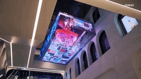 同樣位于商場(chǎng)內(nèi),這次D'strict將創(chuàng)意運(yùn)用在了一塊倒掛的立方體LED屏上,3.5mx6mx1.5m的屏幕足以讓人為之一振,展示了不同的變形幻覺(jué)媒體藝術(shù)。