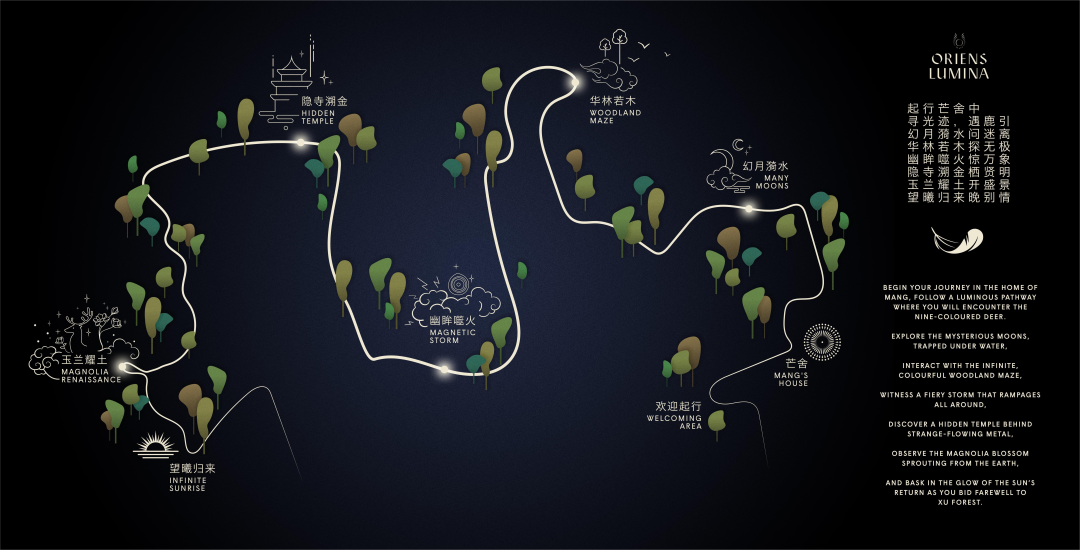 作為奉賢新城文旅項目年度扛鼎之作,LUMINA夜游項目總占地面積超8萬平方米、游覽路線總長約1.5公里。以中央公園現(xiàn)狀為基礎(chǔ),以傳統(tǒng)文化《山海經(jīng)》和陰陽五行學(xué)說為創(chuàng)作靈感,構(gòu)建出一個全世界面積最大、內(nèi)容最為豐富的Lumina夜游。整個森林之旅需要45分鐘到1小時。