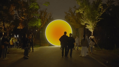 樹蔭婆娑,光影斑駁,通過互動裝置,觀眾可以操控樹林中燈柱的發(fā)光顏色、頻率、位置等,或是明媚閃爍,或是暗光浮動,炫目的視覺色彩沖擊之下,傳遞的是“光”的情緒和色彩。