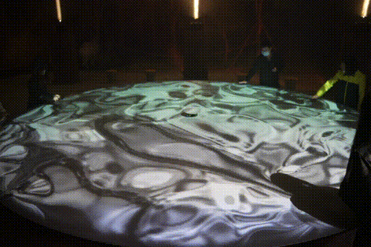 視野中間放置著一個巨大的圓盤,這是一個多人互動裝置,用雙上拂去圓盤上的沙塵,可以看見“賢文化”的具象顯示,而后是星漢燦爛的銀河圖景,美輪美奐。