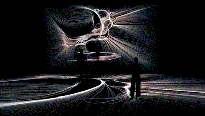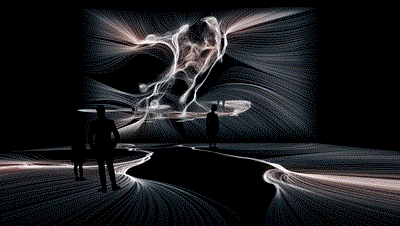 沉浸式藝術展、藝術裝置的迅速發(fā)展,使得藝術創(chuàng)作手法也愈發(fā)多樣化,大量獨立先鋒主義的新興藝術裝置,借助抽象的線條或視覺圖形、生活實物變形來完成藝術裝置的敘事設計。Fields是Tobias Gremmler的作品,他為場景裝置創(chuàng)作的變形虛擬舞者被投射在平行的紗幕上。