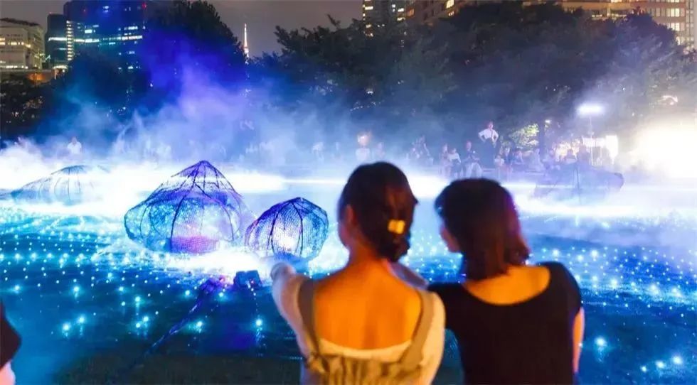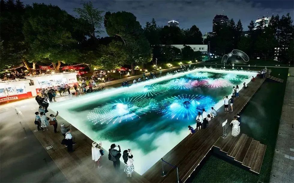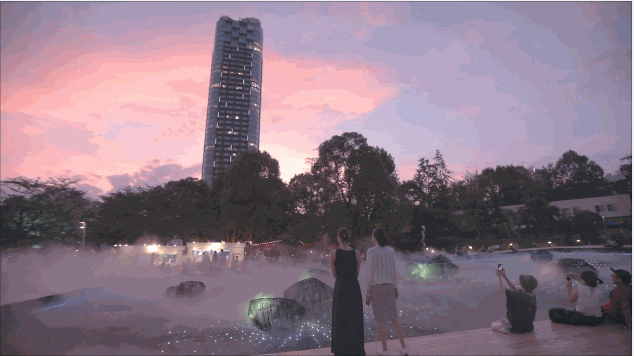 基本的、不斷變化的霧氣和煙花的數(shù)字化燈光一起產(chǎn)生了一種眼睛不會(huì)厭倦的景象。這件作品融入夏日的傍晚,為參觀者提供了一種在炎熱中恢復(fù)身心的體驗(yàn)。