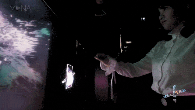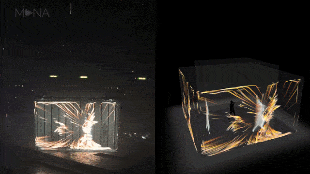 WAVE BOX (薛定諤的貓) 是全息互動體驗裝置。體驗者站在透明介質(zhì)前,通過控制懸浮的虛擬立方盒子,來改變眼前巨型立方空間里的生命物質(zhì)左右演變流動。