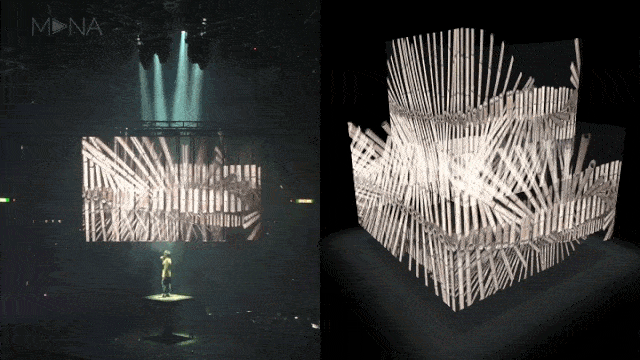 舞美設(shè)計與表演曲目相對應(yīng),比如歌曲“24 City”和“Dementia”的歌詞與城市有關(guān),因而舞臺視覺效果嘗試將人的身體與城市環(huán)境的建筑融為一體。