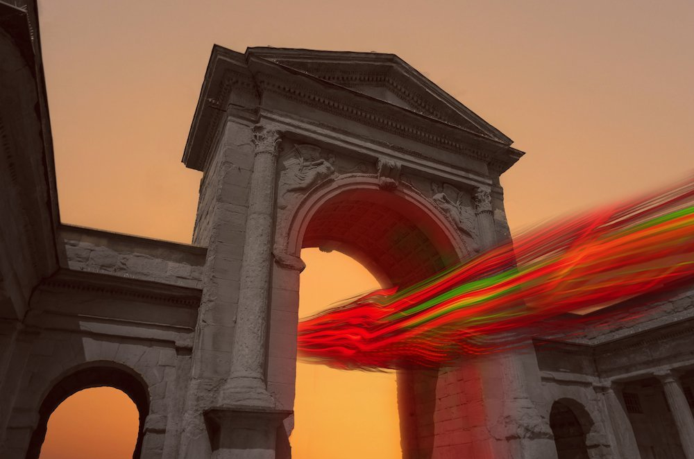 裝置被反射材料包裹。白天,古典的拱廊、流動(dòng)的天空、樹影和草茵被投影在表面之上,物體與環(huán)境的界限變得模糊,裝置本身也成為永動(dòng)的藝術(shù)。夜幕降臨,裝置變得透明且空靈,燈光矩陣呈現(xiàn)出極具未來感的氣質(zhì)。“動(dòng)量”將虛擬藝術(shù)與實(shí)體裝置相結(jié)合。AR 增強(qiáng)現(xiàn)實(shí)技術(shù)打破了時(shí)空壁壘,觀眾可通過社交媒體上的按鈕,自發(fā)創(chuàng)作,讓數(shù)個(gè)以裝置“動(dòng)量”為原型的反光立方體漂浮于不同場域的鏡頭下。