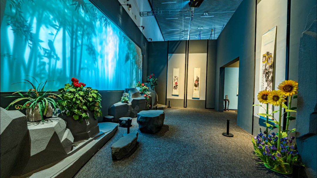 第三個單元名為“一花一世界”,是整個展覽的核心展區(qū),創(chuàng)作團隊在空間構成中運用折角造型,寓意齊白石一生的曲折與堅強。在這里觀眾們可以沉浸在白石老人的花鳥作品之中,真切的體會一代大師對生活的細微觀察及繪畫背后的人生見解,與大師產(chǎn)生共鳴與欽佩之情。