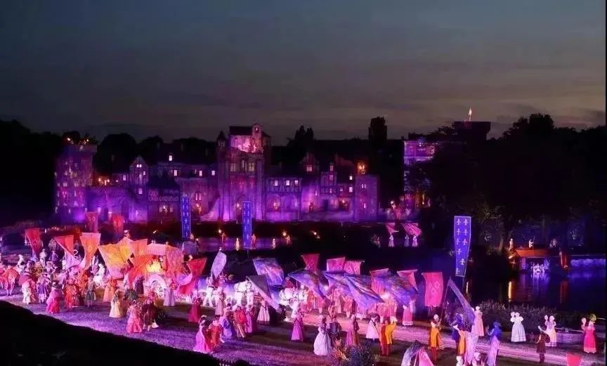 其中,La Cinéscénie是全球規(guī)模最大的夜間表演。整場(chǎng)表演長(zhǎng)達(dá)1小時(shí)40分鐘,采用真人表演、煙花秀、燈光秀、3D投影、無(wú)人機(jī)等相結(jié)合的形式,將表演從海陸空多角度立體呈現(xiàn)。在場(chǎng)景感營(yíng)造方面,主題樂(lè)園貫徹“游客將忘記二十一世紀(jì)”這一核心設(shè)計(jì)理念,在原有歷史建筑的基礎(chǔ)上打造出多個(gè)具有不同時(shí)代氛圍的村落,建筑、餐廳與酒店凸顯文化情調(diào)。