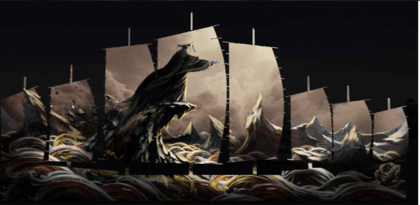 作為舞臺主視覺,我們?nèi)∑呱?ldquo;船帆”為滄海沉浮之寓意。各扇船帆象征著不同的歷史時(shí)期,以此展示碣石山的千載光陰。
