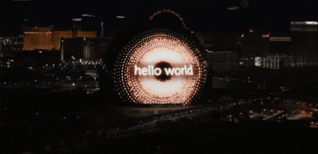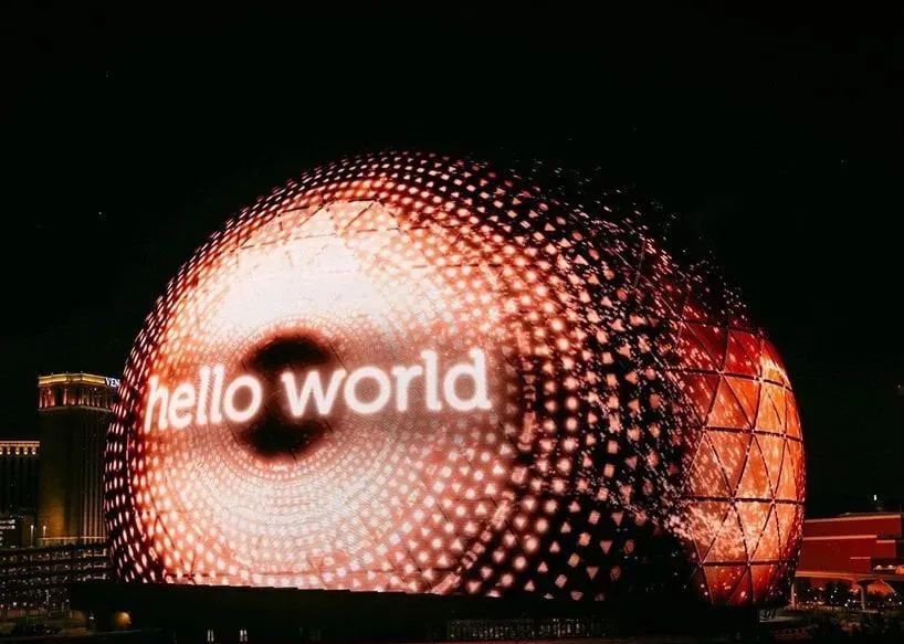 Exosphere擁有令人印象深刻的配置,由大約1萬(wàn)個(gè)LED冰球組成,以2英寸的間隔均勻分布。每個(gè)冰球都配備了 48 個(gè)獨(dú)立的 LED 二極管,能夠展示驚人的 256.4 億種不同的顏色。球體的表演以熱情的問(wèn)候“Hello World”拉開(kāi)帷幕。