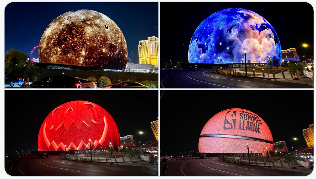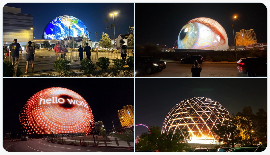 2023 年4月,由 Populous 設(shè)計(jì)的未來(lái)主義音樂(lè)場(chǎng)地球體 The Sphere 點(diǎn)亮了拉斯維加斯的天際線,并將其變成了一個(gè)迷人的照明奇觀。在首場(chǎng)演出期間,球體的外觀,被稱為Exosphere和世界上最大的LED屏幕,用于迷人的展示,展示了動(dòng)畫(huà)場(chǎng)景,包括煙花,月球,甚至一個(gè)巨大的眨眼球,用“你好世界”的信息迎接客人。