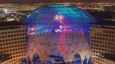 整個(gè)建筑的圓頂裝有252臺(tái)投影儀,形成了沉浸式360度投影表面,館內(nèi)外的參觀者均可看到,這使得它成為世界上最大的360度投影面。