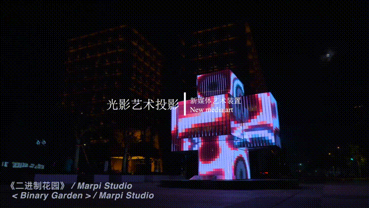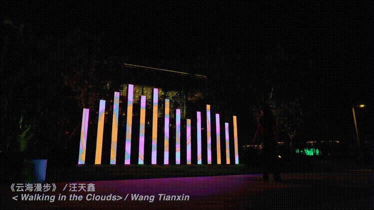 白天作為空間雕塑反射周圍的環(huán)境并通過鏡面與行人互動;夜幕降臨,塔身LED視覺系統(tǒng)啟動,逐漸演變?yōu)橐粋€炫麗的人工智能數(shù)字塔,呈現(xiàn)著當(dāng)代媒體藝術(shù)家們基于人工智能技術(shù)所創(chuàng)造的全新視覺語言。