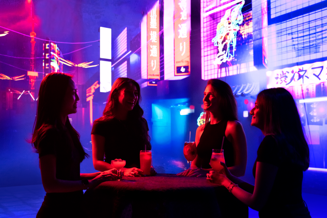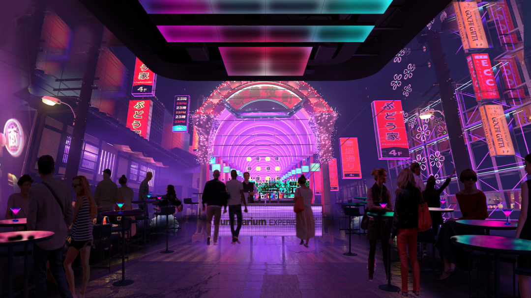 白天,這里是 “ WILD: A Safari Experience ” 預(yù)演的夢幻場地;夜晚時(shí)分,它將化身為令人陶醉的沉浸式酒吧 —— The Bar at Illuminarium。得益于裸眼VR技術(shù),Illuminarium After Dark 突破了傳統(tǒng)酒吧的風(fēng)格模式,可以自由切換7種沉浸式主題:或許是熱鬧的東京街頭,可能是黃昏落日的山坡,還可以在幽藍(lán)靜謐的海底冥想亦或是巴黎花園里的小酌……亞特蘭大的夜生活想象將被重構(gòu)。
