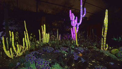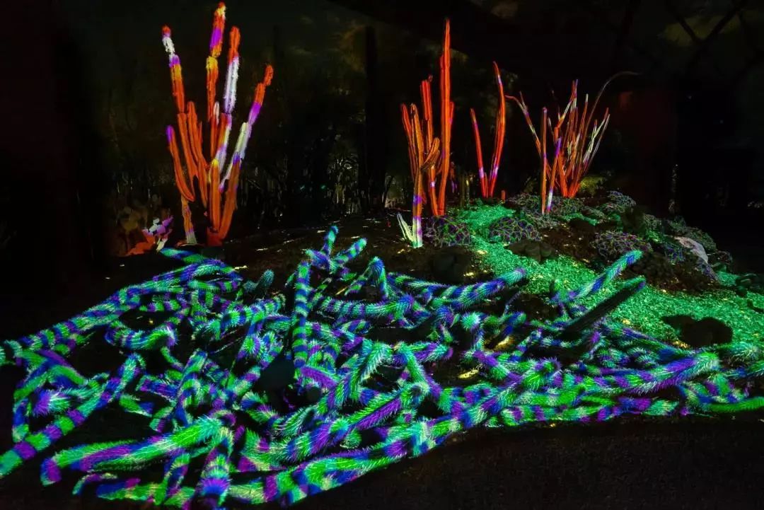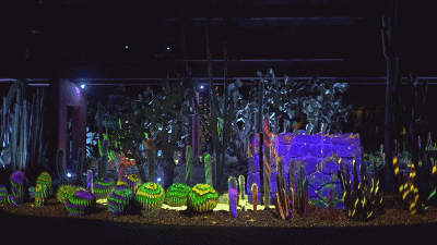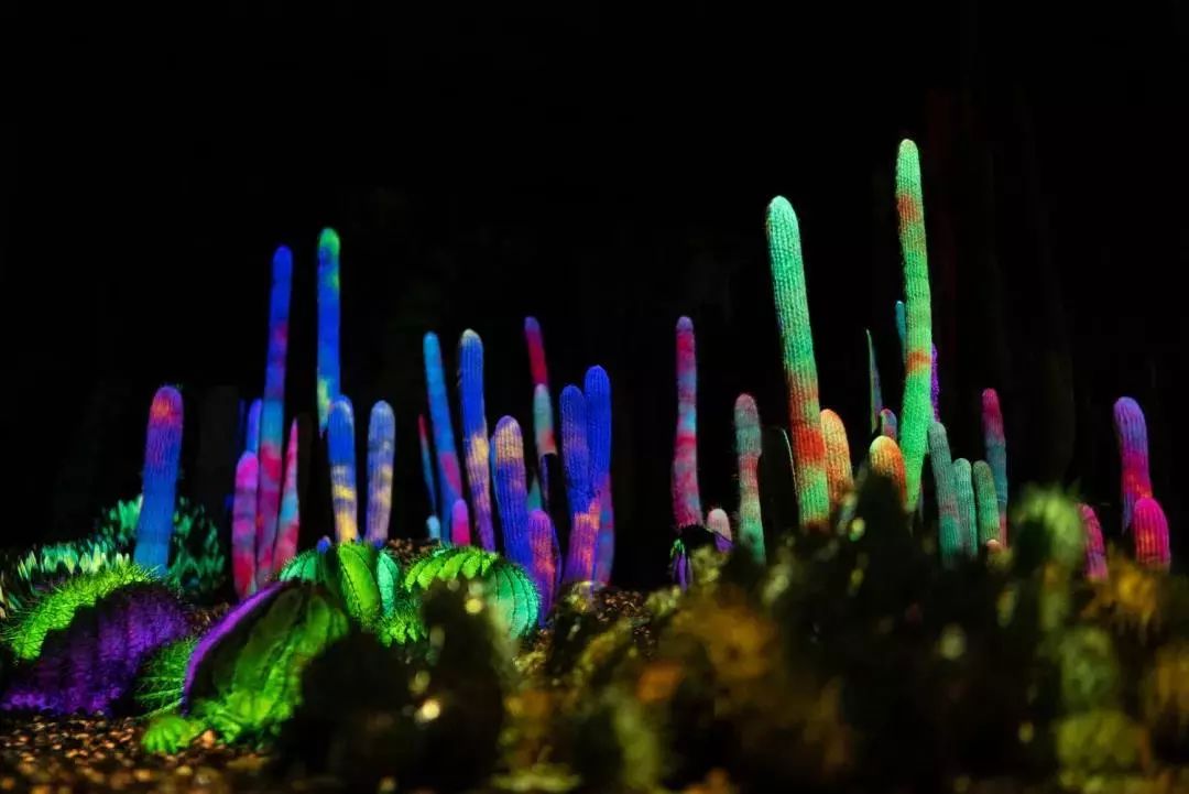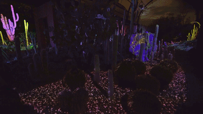 沙漠植物園的Electric Desert擁有7個獨立裝置。而Cacti Synthesia是其中一個,利用投影和照明,將仙人掌、多肉植物和巖層變成了活生生的夜間畫布,使花園及其獨特的景觀作為新的和令人興奮的音頻和視覺體驗的背景。