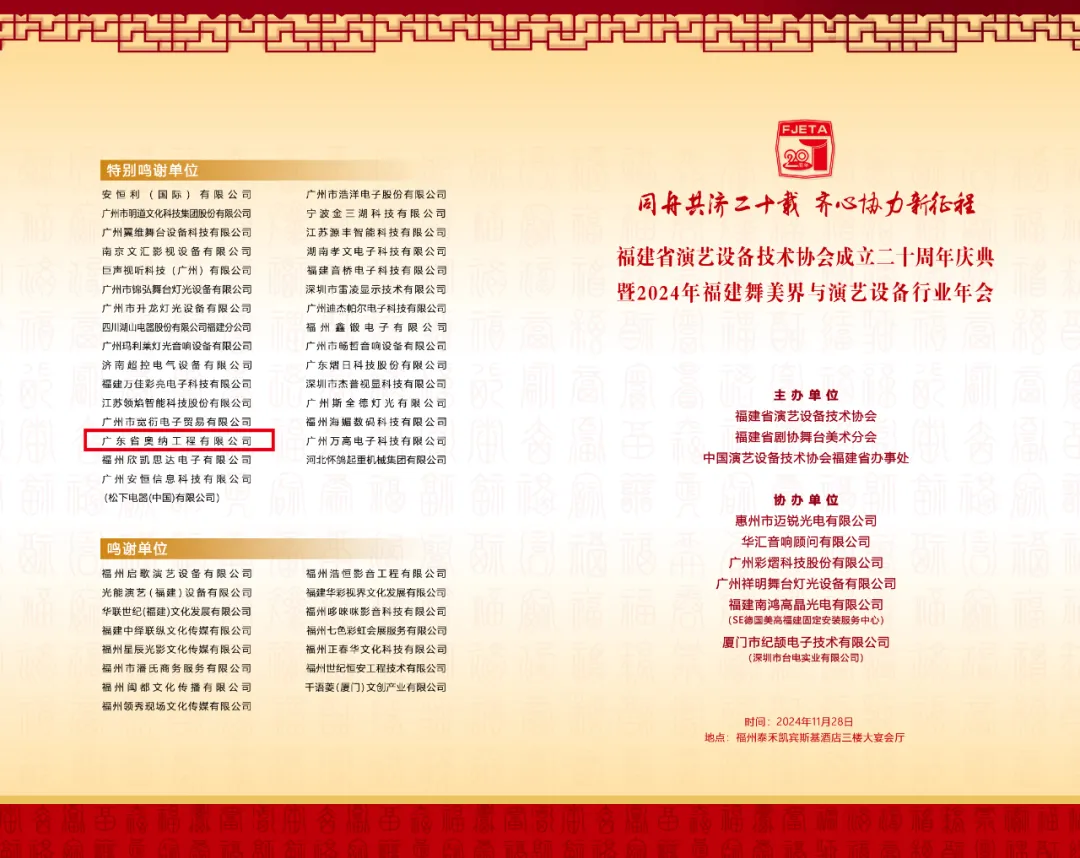 2024年11月28日,福建省演藝設(shè)備技術(shù)協(xié)會成立二十周年慶典暨2024年福建舞美界與演藝設(shè)備行業(yè)年會在福州泰禾凱賓斯基大酒店隆重舉行。本次慶典以“同舟共濟(jì)二十載,齊心協(xié)力新征程”為主題,回顧光輝歷程,共話美好前景。此次大會旨在對行業(yè)最新動態(tài)展開深入且全面的探討,挖掘潛在機(jī)遇,剖析現(xiàn)存挑戰(zhàn),為行業(yè)的前行之路點(diǎn)亮明燈,指引方向,推動行業(yè)朝著更具創(chuàng)新性、更富活力的方向蓬勃發(fā)展。