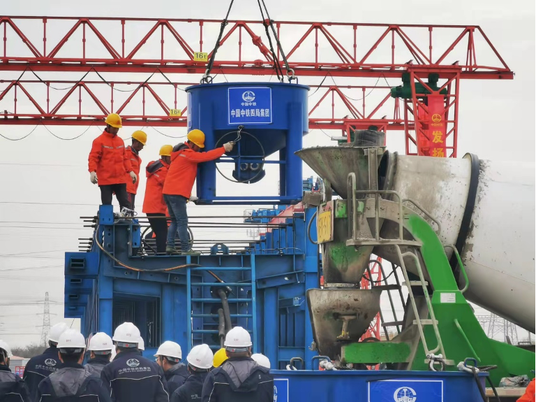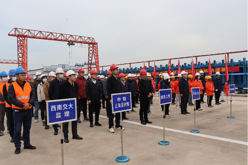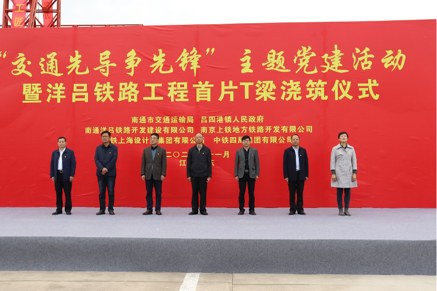 11月16日上午,“交通先導爭先鋒”黨建主題實踐活動暨洋呂鐵路首片T梁澆筑儀式在中鐵四局集團有限公司啟東制梁場舉行,“黨員先鋒隊”和“青年突擊隊”現(xiàn)場接受授旗。10點28分,隨著南通沿海集團副董事長黃浩宣布,洋呂鐵路首片T梁預制正式開始澆筑,標志著洋呂鐵路建設進入一個新階段。