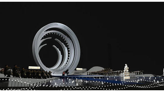舞臺中心主體構筑分為四組,層層展開,用簡潔抽象化的海浪形式營造表演的氛圍空間。4組直徑不等的圓環(huán)尺寸分別為直徑20m、直徑17m、直徑15m、直徑12m,主體造型上采用全鋼結構形式搭建而成。圓環(huán)上吊掛燈光、水簾、冷焰火等設備,總體重量約100噸。