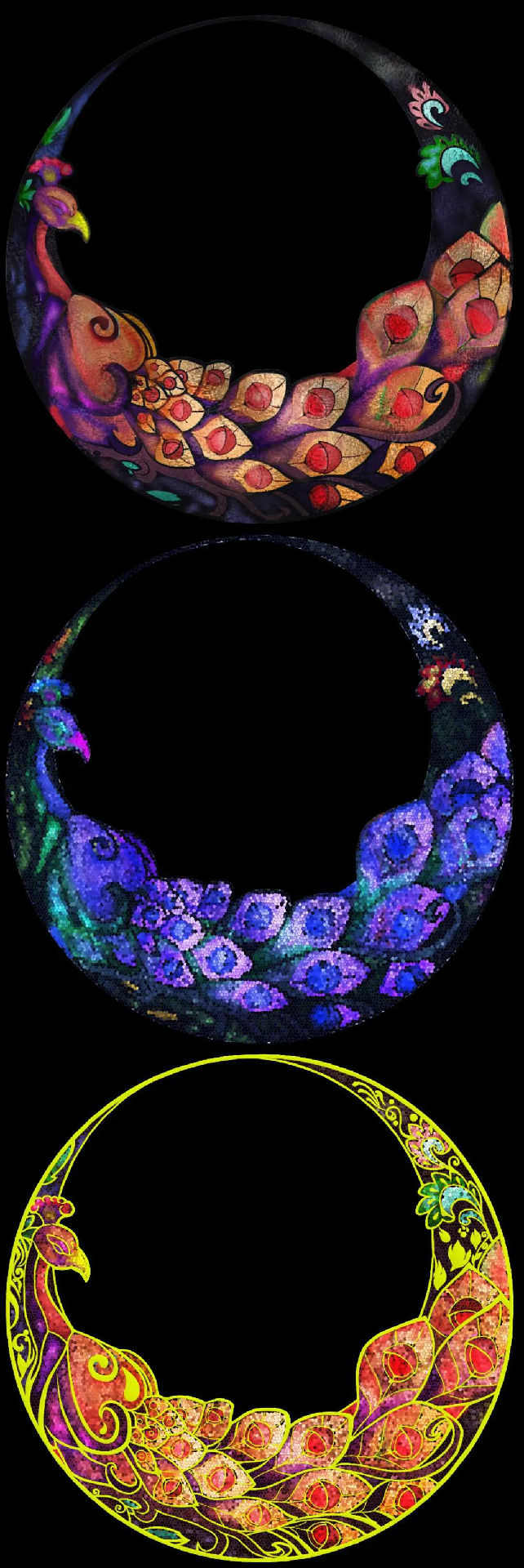 表盤設計的過程,經(jīng)歷了從人物到植物再到紋樣的過程,最后選定的是高雅美麗的孔雀形象??兹副肀P的材質(zhì)設計,和形象設計一樣,也經(jīng)歷了多輪推敲的創(chuàng)作過程,從顏色漸變到毛玻璃,最后選用了鑲嵌金絲寶石材質(zhì)。地面的裸眼3D中心舞臺視覺則打造了與孔雀相配合的抽象孔雀翎效果。