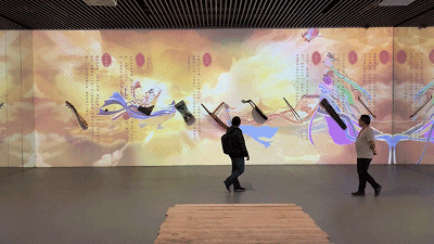 壁畫是藝術(shù)的一種表現(xiàn)形式,其中敦煌壁畫尤為出名。但隨著時(shí)間的流逝,壁畫也會(huì)逐漸褪色。而互動(dòng)裝置中的壁畫不會(huì),它會(huì)隨著你的經(jīng)過,展現(xiàn)出每一個(gè)樂器的歷史,這就是體感互動(dòng)與敦煌壁畫的結(jié)合。