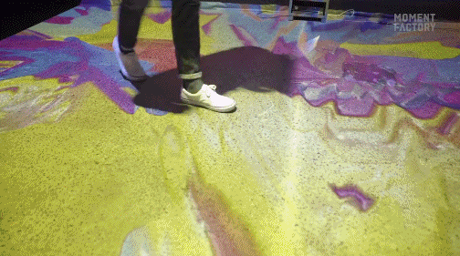 在【Symbiotic Studio】的“共生”空間,被潑墨式的彩色填滿,從腳下到四周到天花板,720度沉浸式包裹,都記錄著觀眾走過的痕跡,隨動(dòng)作大小、快慢變化以及觸摸感應(yīng)而變化。
