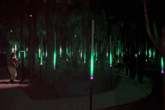 樹蔭婆娑,光影斑駁,通過互動裝置,觀眾可以操控樹林中燈柱的發(fā)光顏色、頻率、位置等,或是明媚閃爍,或是暗光浮動,炫目的視覺色彩沖擊之下,傳遞的是“光”的情緒和色彩。
