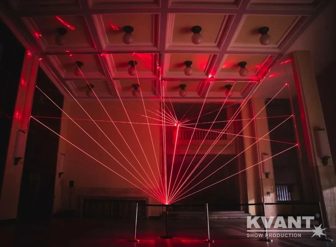 他們使用了KVANT激光燈創(chuàng)造出一個引人注目的燈光裝置——空間線條游戲。進入建筑當中,游客便能感受到激光在建筑內交織、分離、融合的畫面,感受到巨大的視覺沖擊力。