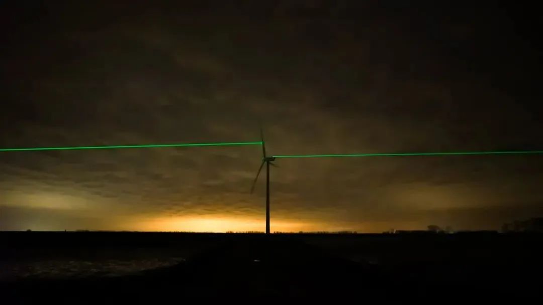 綠色激光束從一個風車的頂部以光速穿越1600英尺的距離發(fā)射到下一個風車的葉片,并追隨風車葉片同步旋轉,完美地實現(xiàn)了對高速運轉物體的精準定位!