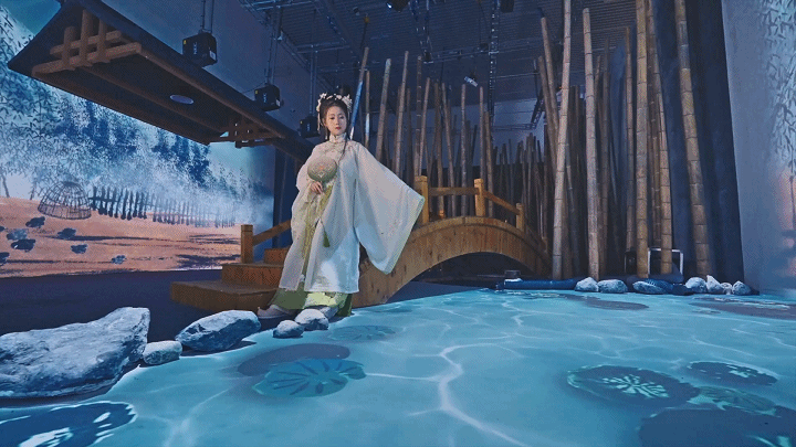 穿過竹林,踏上木橋,橋下以數(shù)字投影呈現(xiàn)流水緩緩流淌而過,魚蝦在水中歡游的數(shù)字影像,遠處團團輕霧在水面周圍浮游。撥開這片迷霧,呈現(xiàn)在面前的是經(jīng)過藝術抽象化的畫中之屋,屋前一片略偏方正的水塘波光粼粼,遠處的山林上仿佛有幾只飛鳥不時掠過。創(chuàng)作團隊以數(shù)字手段復活齊白石對家鄉(xiāng)的回憶,勾勒出一個文人的理想鄉(xiāng)間隱居生活,也是齊白石的烏托邦。