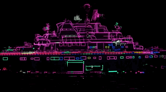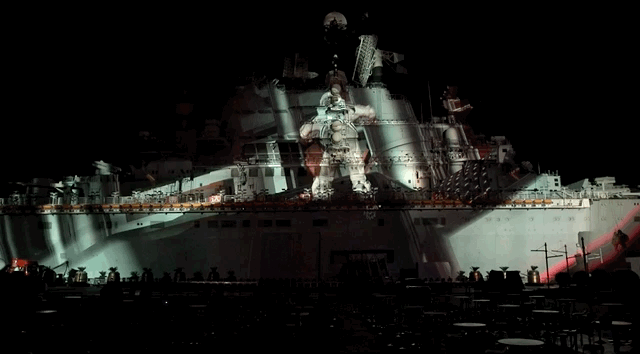 本場投影秀使用42臺40K工程投影機同時工作,覆蓋“基輔號”航母整個艦體,通過裸眼3D動畫再配合百余臺可編程控制的光束燈以及五臺激光燈共同絢麗演繹16k視頻的超高難度震撼畫面,讓數(shù)千名現(xiàn)場觀眾經(jīng)歷了一段回味無窮的光影探索之旅!